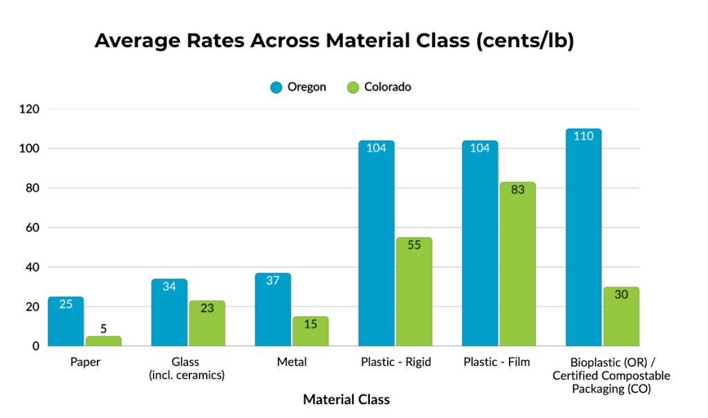 We find the first steps of improvement capital in Oregon and Colorado, the first to publish the fees that packaging producers will be charged for a wide range of packaging materials such as glass, aluminum, rigid plastic, flexible plastic and compostable packaging.