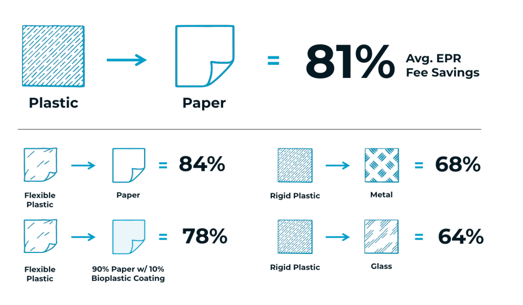 In this scenario, the savings are significant: $11 million in fees saved across the seven EPR states. Of course, these savings will depend on a multitude of factors, and the cost of switching to a new material needs to be factored in. But even when an alternative such as paper is more expensive, innovation can lead to savings. More back-of-the-envelope calculations show that in this case, a 34 percent increase in material costs would still lead to over $600,000 in net savings. These are just sample calculations, but the take-home message is clear. Strategically switching to lower-fee materials can add up to meaningful savings.