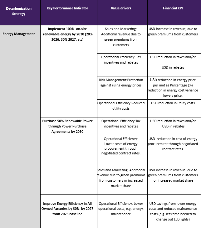 Even if reporting standards don’t improve, practitioners can still shift sustainability reporting from an onerous compliance checkbox to a strategic business exercise, by following the above recommendations and then mapping their sustainability KPIs to ESG reporting metrics. The following is an example which illustrates the proposed financial upside of decarbonization through improved energy management practices.