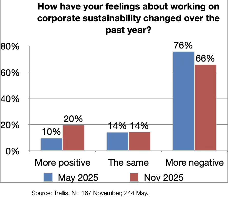 The sliver of Trellis readers who said they had positive feelings about working in sustainability doubled to 20 percent in the recent survey. Two-thirds of the 167 professionals who responded remain negative about the profession, down from three-quarters in May.